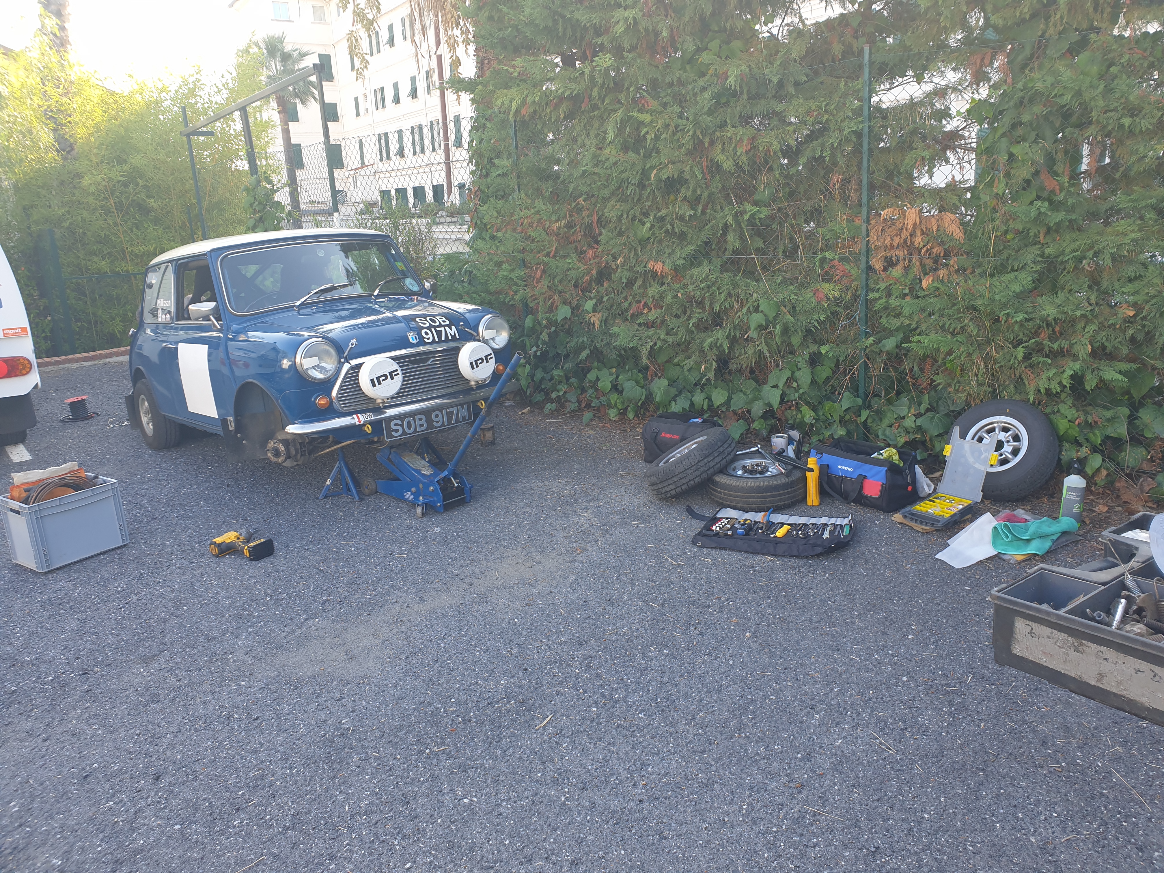 Um ca. 11:30 Uhr konnten wir unsere Rallye-Schilder in Empfang nehmen und montieren. Kurz darauf erfolgte die technische Abnahme. Meine Sorge, dass der Mustang den 'Noise-Test' nicht bestehen könnte, erwies sich als unbegründet, denn es fand kein solcher Test statt, da dieser in Italien - wen wunderts - nicht vorgeschrieben ist. Alle anderen Testpunkte wurden ohne jegliche Beanstandung erfüllt, selbst das COVID-Desinfektionsequipment wurde als 'mustergültig' eingestuft. Brauchen werden wir es vermutlich - wie in Schottland - auch hier nie, denn ich habe es 1:1 von der Highland-Thistle übernommen.