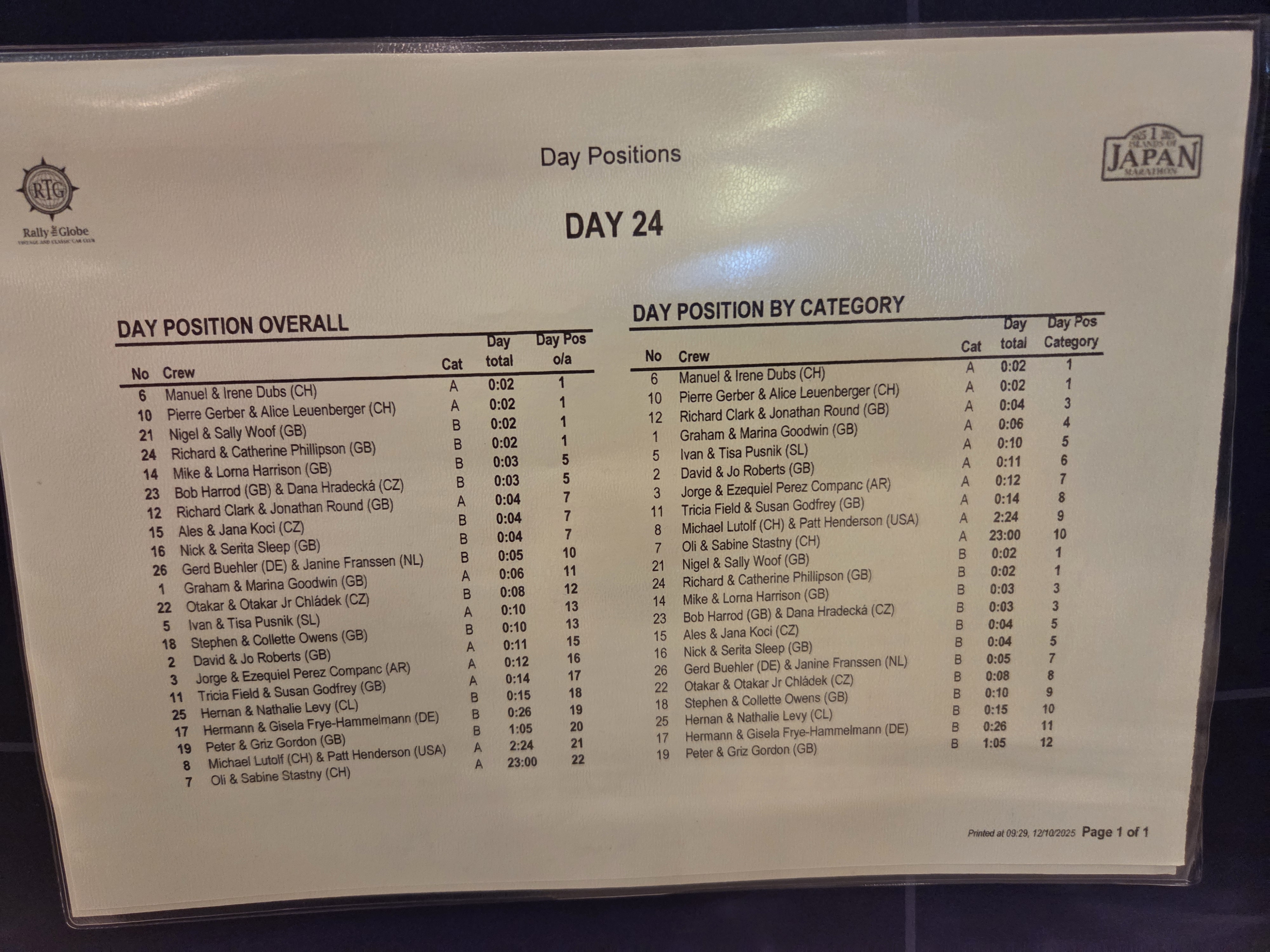 Wie gestern schon erwähnt, war der Tag wettkampfmässig erfolgreich, wir wurden zusammen mit 3 anderen Teams Tageserste. Da wir in dieser 4-er Gruppe das älteste Auto haben, standen wir auch zuoberst auf der Liste .