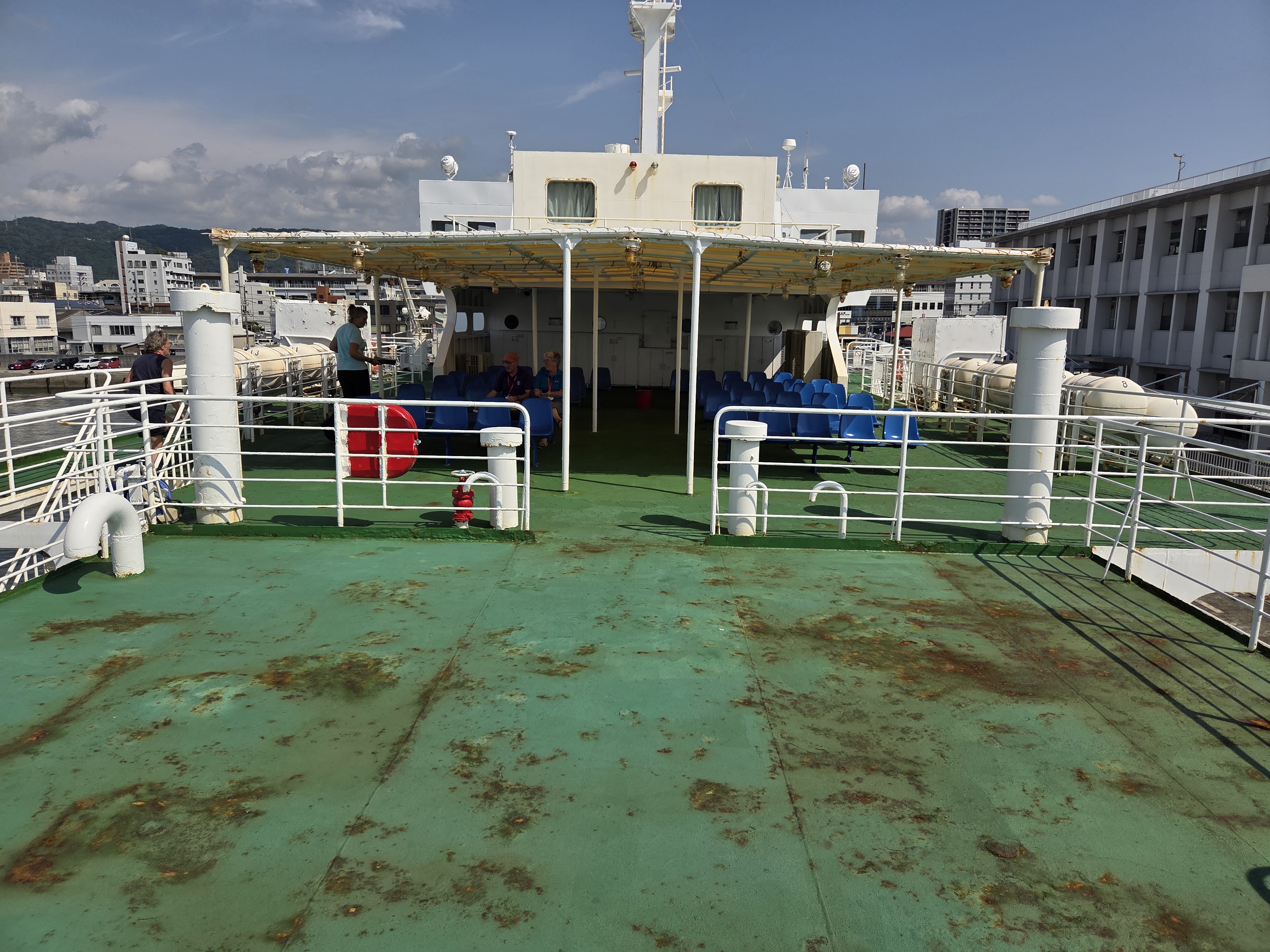 Auf die Insel Kyushu würde auch eine Autobrücke führen, allerdings hätten wir dazu einen langen Umweg machen müssen. Der Fährbetrieb zwischen der Haupt- und dieser Insel ist deshalb nur noch von untergeordneter Bedeutung und so sehen die Fährschiffe auch aus. Aber da wir nach 2 Stunden gut angekommen sind, war soweit alles in Ordnung.