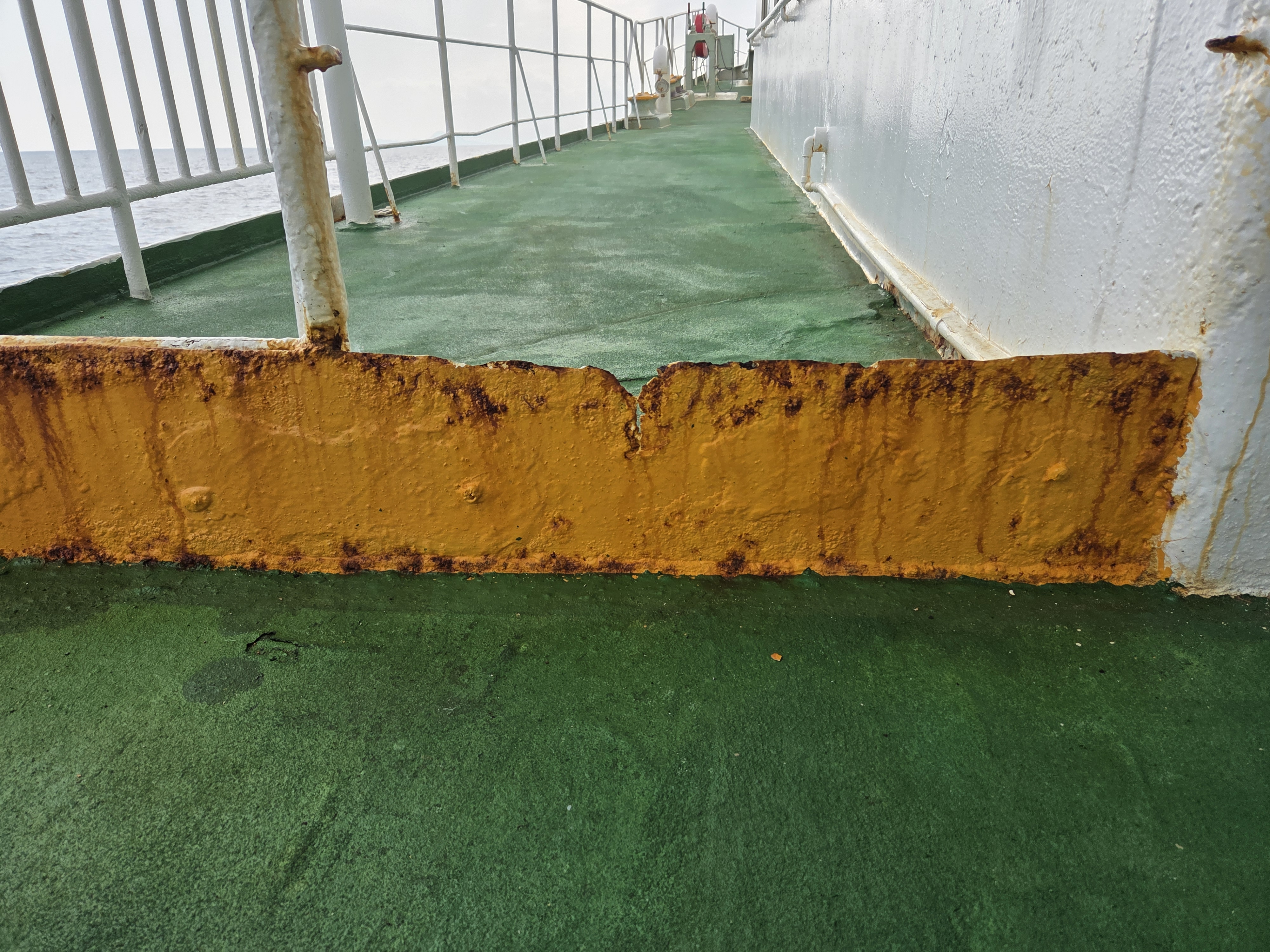 Die Fähre selber war relativ klein und fasste ca. 40 Fahrzeuge. Sie machte einen wenig vertrauenswürdigen Eindruck, der Begriff 'Seelenverkäufer' scheint passender zu sein. Alles Metall ist vom Rost angegriffen und vielfach wurde einfach darüber gepinselt. Ich hoffe schon, dass lediglich nicht tragende Elemente durch die vielen Farbschichten zusammen gehalten werden und bei den tragenden Elementen auch noch etwas Eisen vorhanden ist.