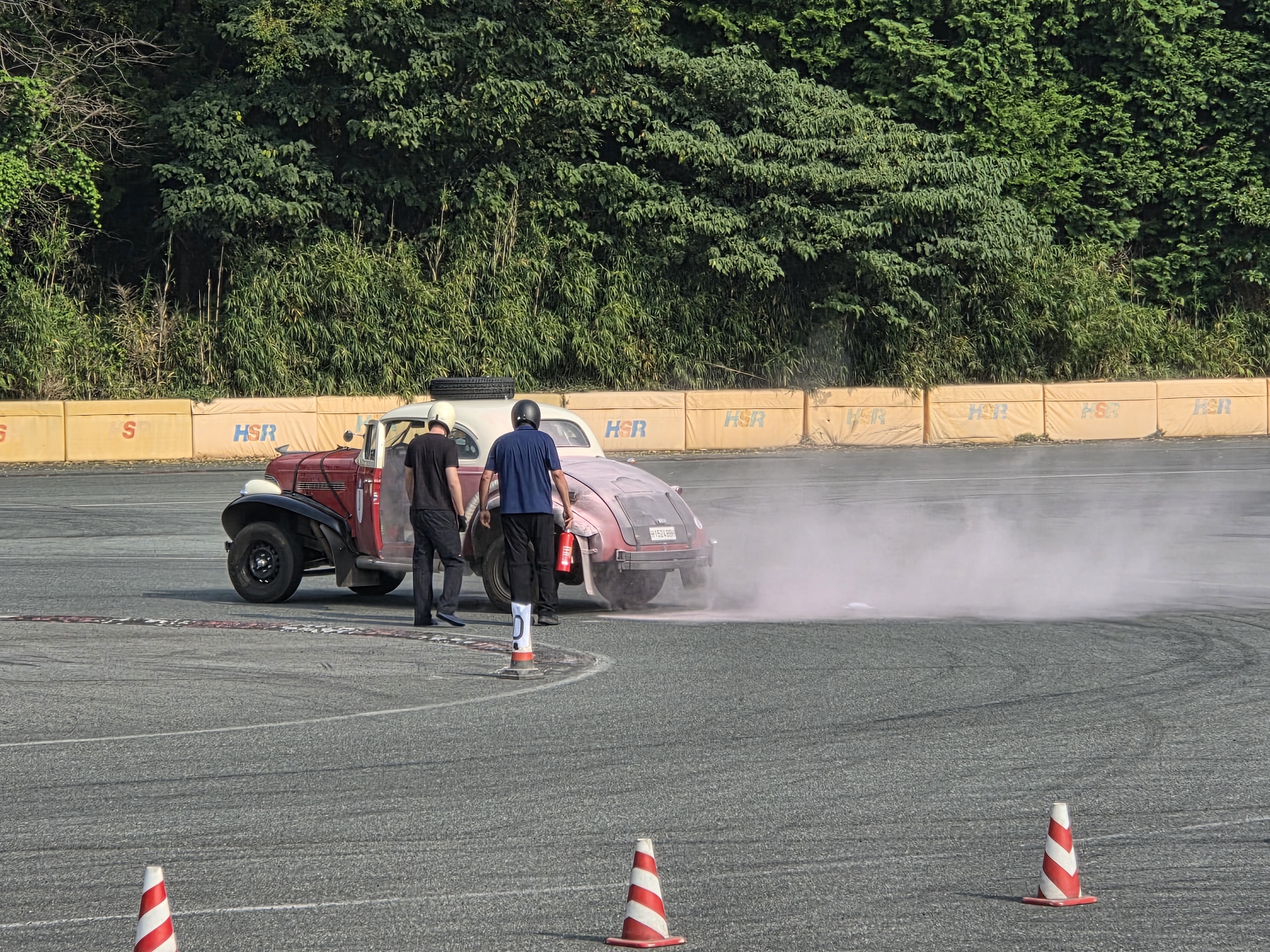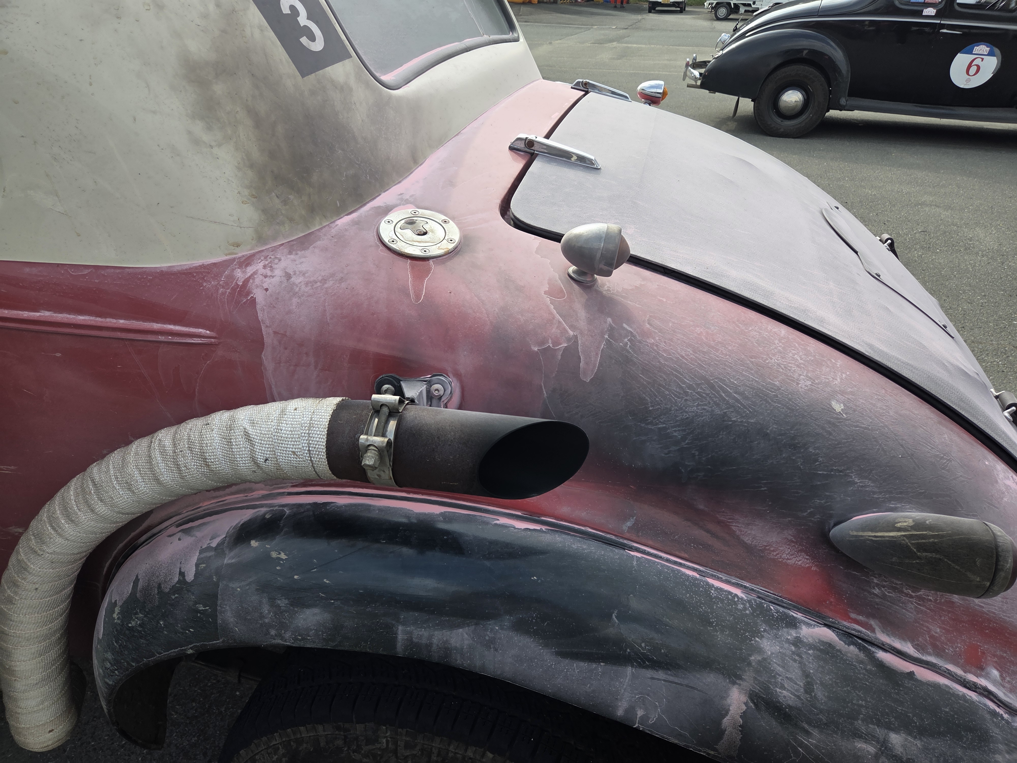 Eine kleine Schrecksekunde erlebte das Team mit der Startnummer 3 auf dem heutigen 1. Rundkurs. Nach einer scharf gefahrenen Kurve begann ihr Chevrolet Fangio hinten links auf Höhe des Benzineinlassstutzens zu brennen! Offenbar hat sich das aus dem Entlüftungsloch herausschwappende Benzin am 15 cm unterhalb liegenden heissen Auspuffende entzündet. Sie haben es schnell bemerkt, angehalten und das Feuer mit dem Feuerlöscher - der in jedem Rallyefahrzeug Pflicht ist und am Start im Rahmen des Scrutineering überprüft wird - gelöscht. Ausser Lackschäden ist nichts passiert. Wer mit dem Rallyesport etwas vertraut ist, weiss, dass bei allen diesen Fangios der Auspuff an der Seite des Fahrzeuges im Rahmen der Rallyevorbereitung durch bestimmte Firmen hochgezogen wird und unmittelbar unter dem Benzineinfüllstutzen endet. Die daraus resultierenden möglichen Folgen sollten sich die Besitzer solcher Fahrzeuge in einer ruhigen Minute nochmals zu Gemüte führen ...