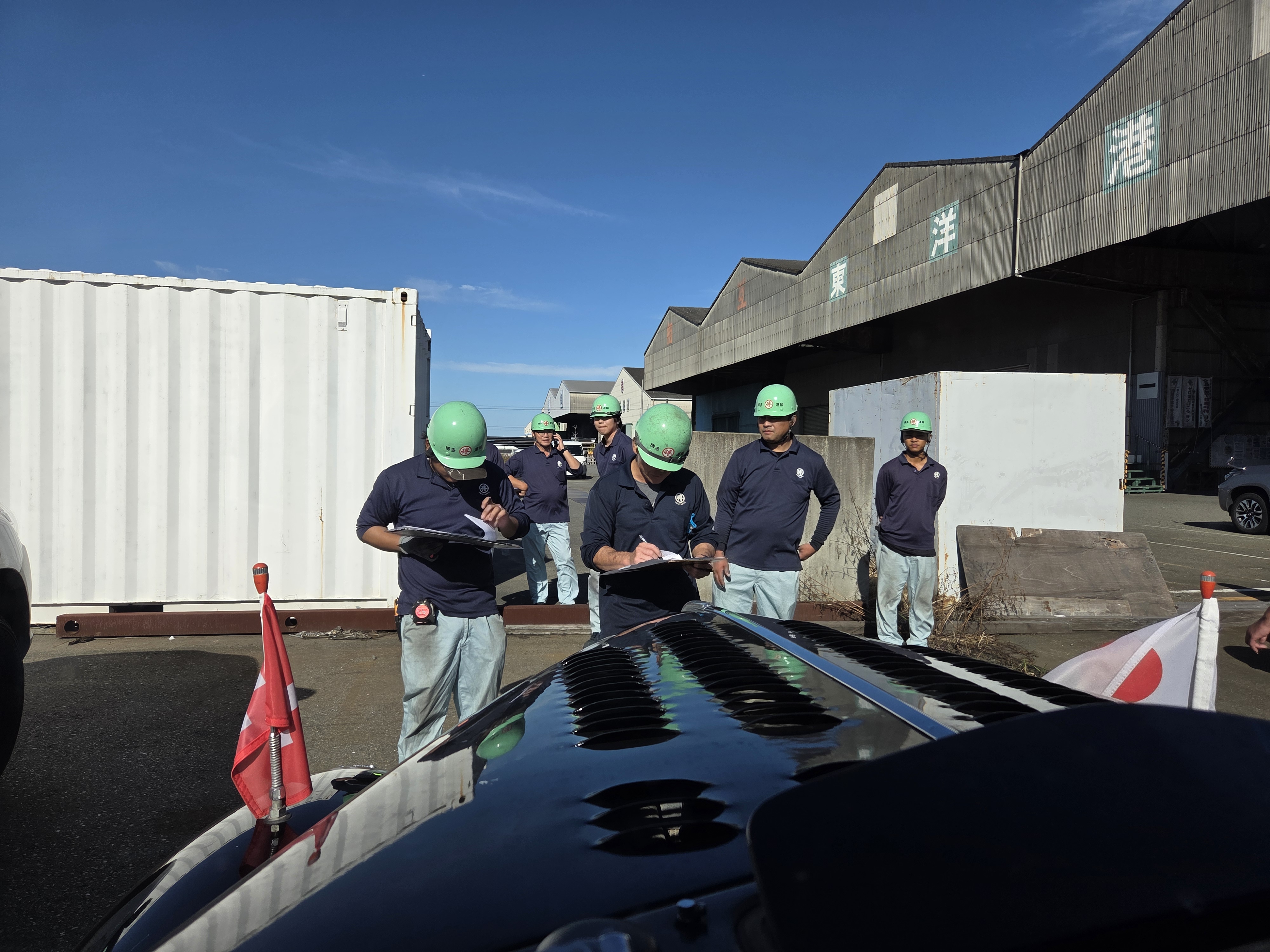 Heute Morgen haben wir um 09:00 Uhr alle unsere Fahrzeuge ins ca. 8 km entfernte Lagerhaus direkt am Meer gebracht und sind mit dem Taxi zurückgefahren. Der Fahrzeugempfang wurde in vermutlich typisch japanischer Manier abgehalten: Ich durfte den mir zugewiesenen Parkplatz nur bis in die Hälfte befahren. Auf der vorderen Parkplatzhälfte standen zwei mit Checklisten und grünen Helmen bewaffnete Hafenmitarbeiter, welche emsig in ihre Papieren herumkritzelten und vermutlich die englische Registrierungsnummer von 'Luigi' suchten und auch fanden. Begleitet oder überwacht - so genau konnte ich das nicht erkennen - wurden sie von 4 weiteren nur mit grünen Helmen bewaffneten Hafenmitarbeitern, welche aber nie Anstalten zu irgendwelchen Arbeitstätigkeiten machten. Erst nachdem alles seine Ordnung und Richtigkeit hatte, durfte ich 'Luigi' auf dem ganzen Parkfeld abstellen und die nötigen Papiere übergeben. Da aber auch ein Mitarbeiter der Firma CARS vor Ort war, wird die Rückreise wie gewohnt reibungslos klappen.