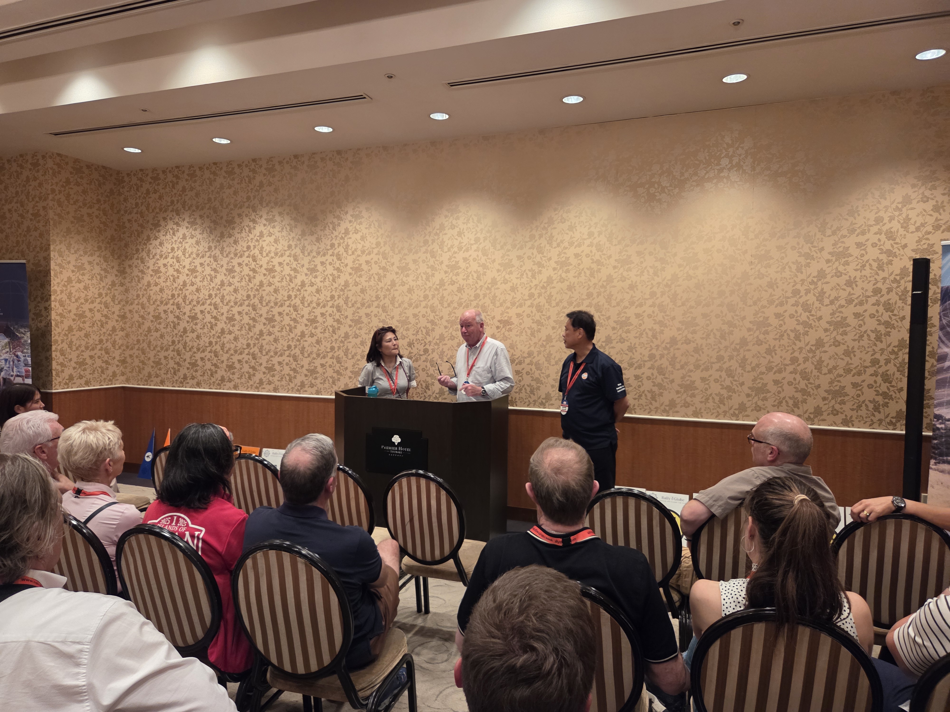 Später folgte das Fahrerbriefing mit der Vorstellung des ganzen Organisationteam (mehr als 20 Leute inkl. der einheimischen japanischen Begleittruppe). Anlässlich dieses Briefings erfolgte auch nochmals ein ausführlicher Hinweis, wie man sich bei einem Erdbeben zu verhalten hätte. Das sorgte jedoch für mehr Verwirrung als Verständnis, denn man soll bei einem Erdbeben das Auto verlassen, aber ob man dann in der Natur draussen von den Bären verschont bleibe, konnte nicht zufriedenstellend beantwortet werden. Letztendlich wurde uns empfohlen, genau das zu tun, was die Einheimischen auch tun. Das mag ja in Städten gut sein, aber wir werden offenbar vielerorts durch Gegenden fahren, wo keine Menschenseele sondern eben nur Bären anzutreffen sind. Wir lassen das jetzt Mal auf uns zukommen ...