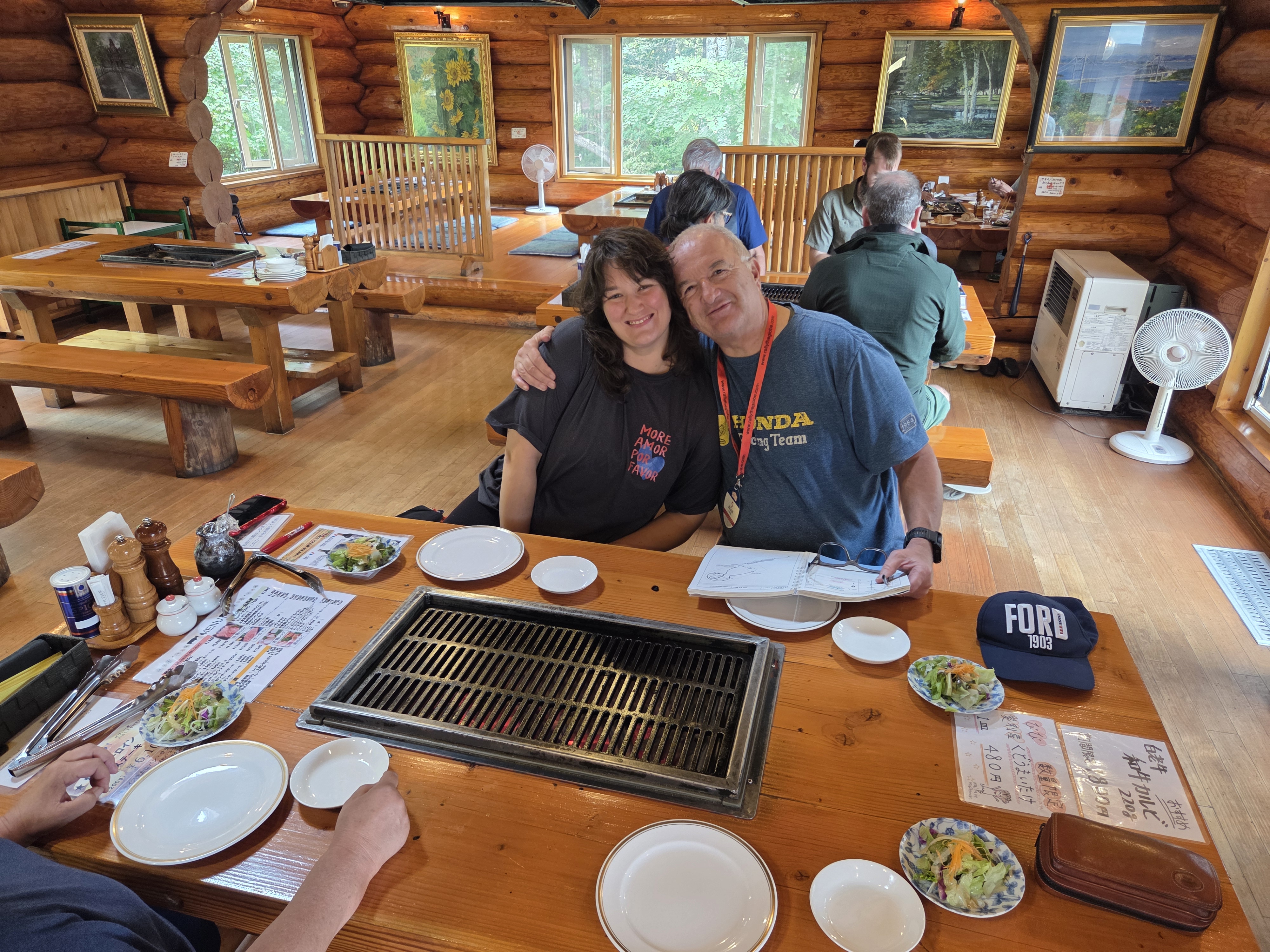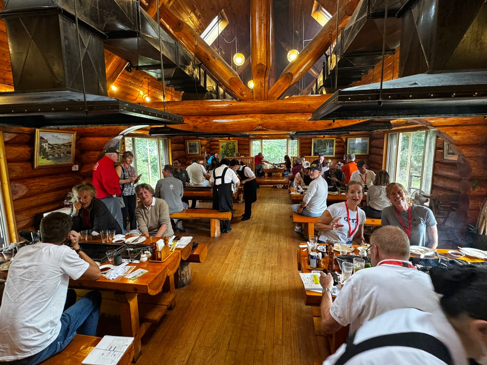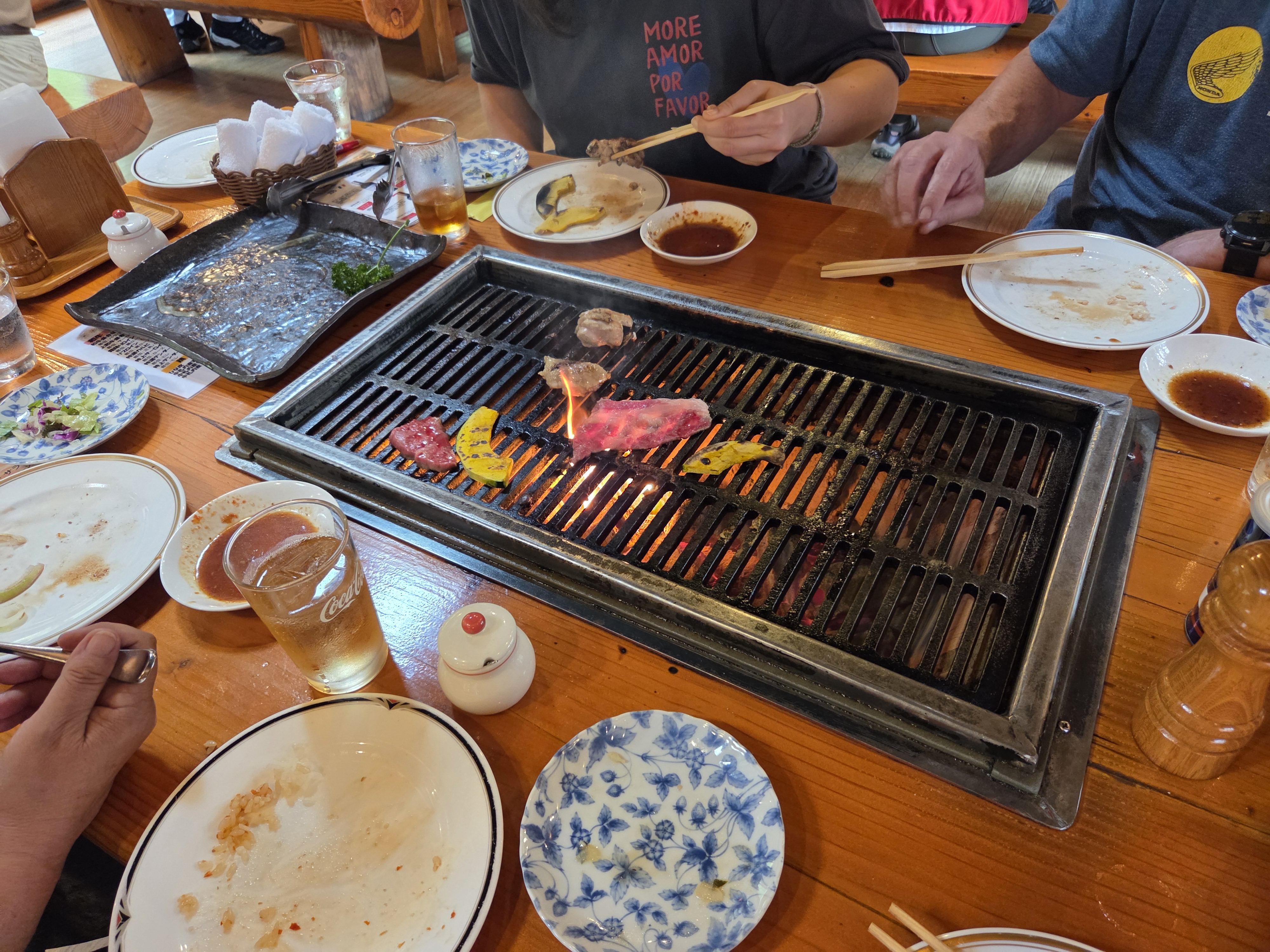 Ansonsten hatten wir den ganzen Tag recht schönes Wetter bei Temperaturen um 20° Celsius. Zum Mittagessen gab es Tischgrill und zwar im wahrsten Sinne des Wortes. Im jeweiligen Tisch mit Platz für 6 Personen war ein Holzkohlengrill mit einer Fläche von ca. 60cm x 30 cm eingelassen und über jedem Tisch war eine Rauchabzughaube montiert. Hat alles wunderbar geschmeckt!