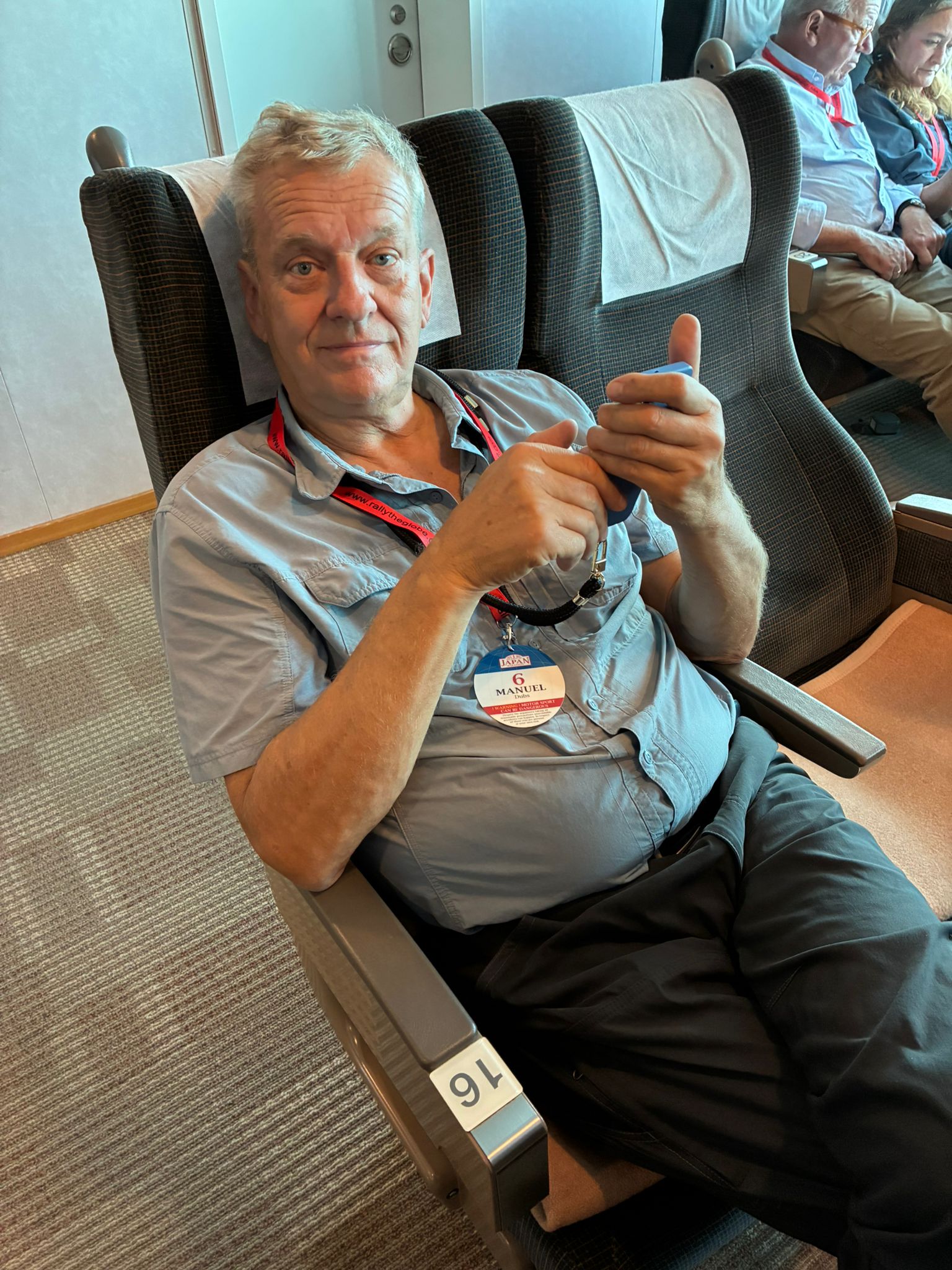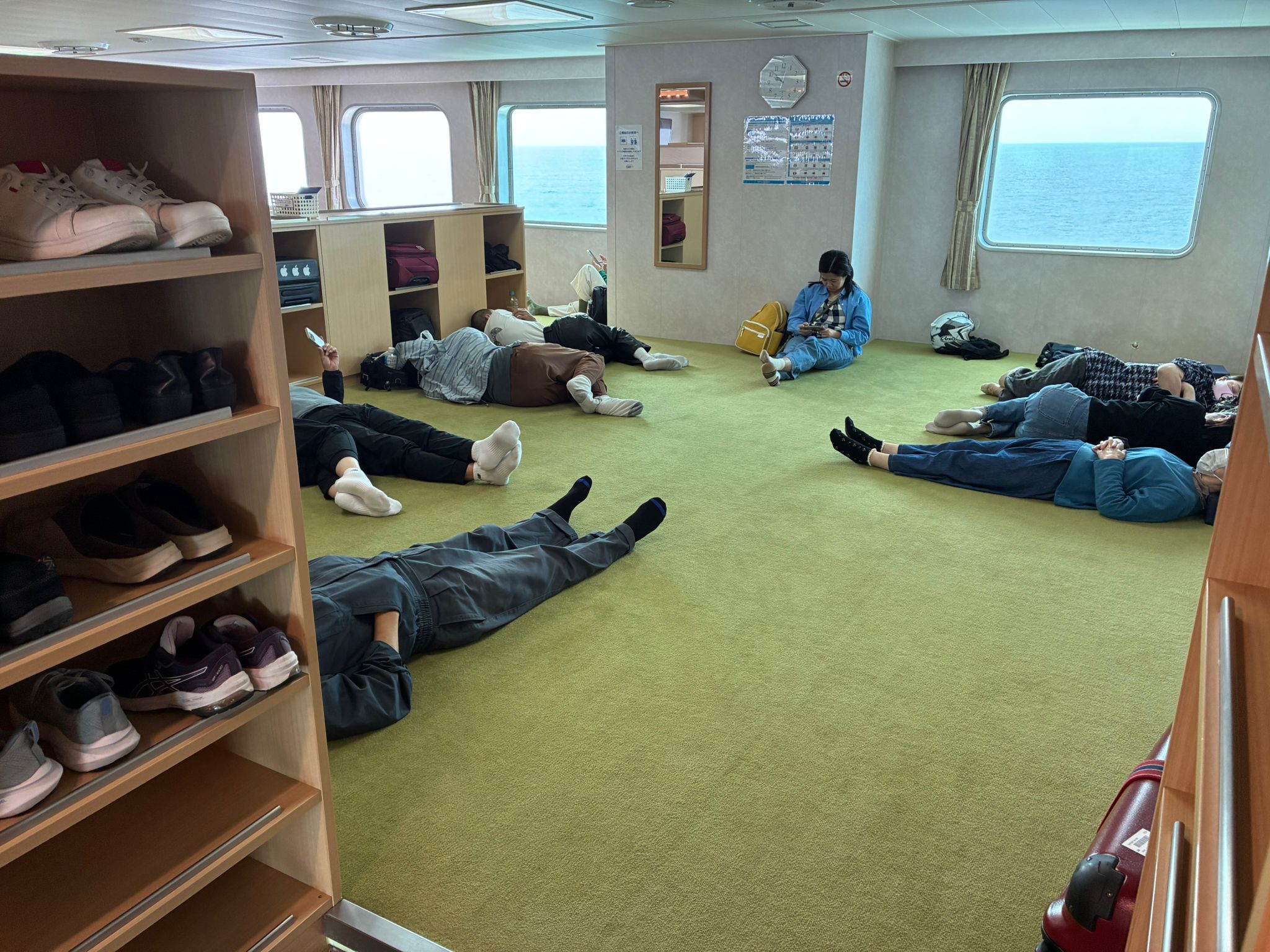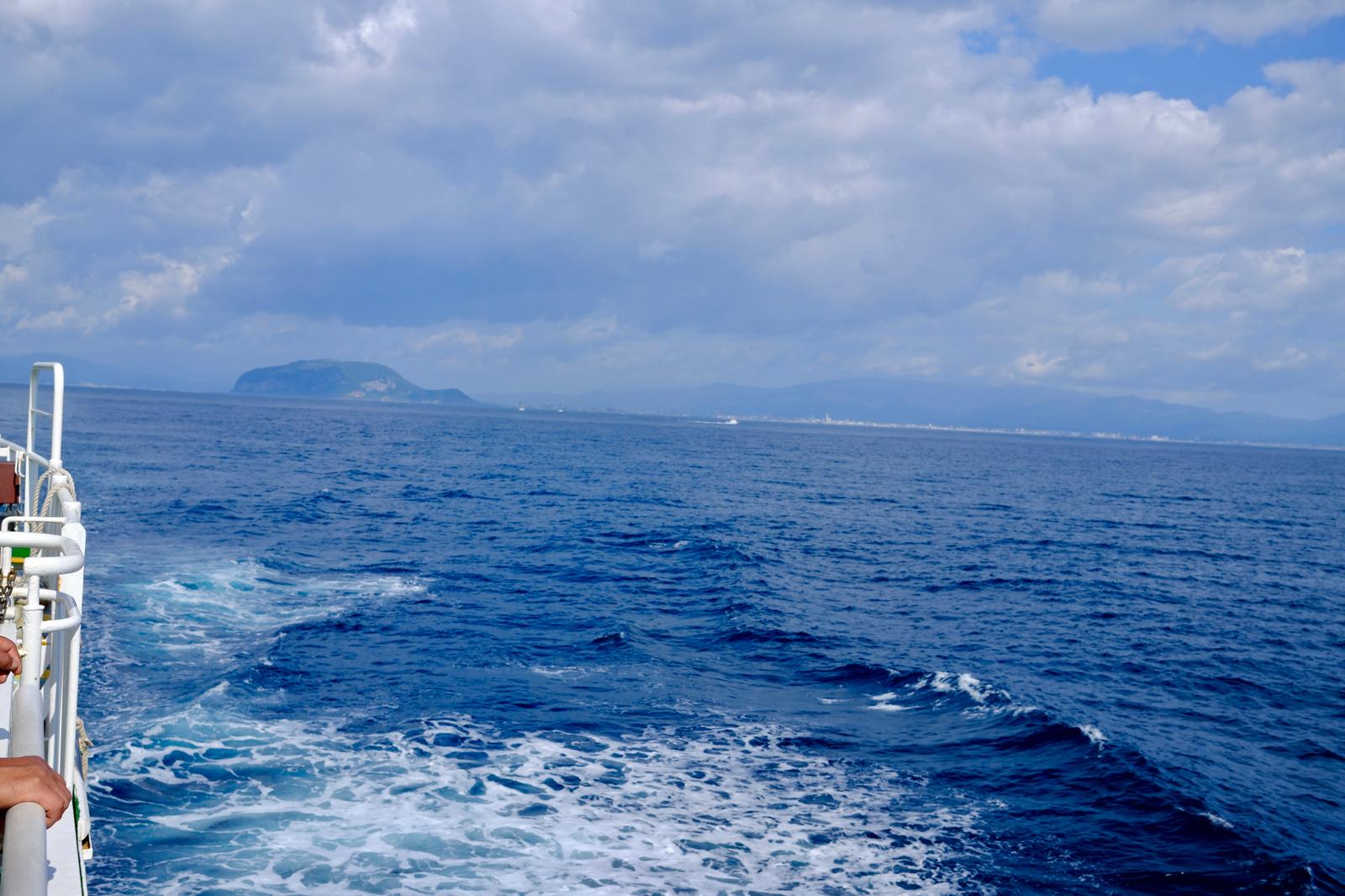 Die Fährüberfahrt dauerte gut 90 Minuten und startete pünktlich um 09:10. Beim Einschiffungsprozedere entstand etwas Hektik, weil einfach zu viele japanische Hafenarbeiter ihr Bestes geben wollten. Mit roten Leuchtstäben, Trillerpfeiffen und intensivem Winken wurden wir nach einem - auch nach dem x-ten Versuch - nicht nachvollziehbaren System auf die Fähre beordert. Auf der Fähre selber wurden dann nochmals umplatziert, aber am Schluss waren alle Fahrzeuge verladen.