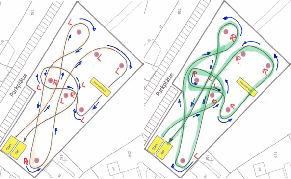 Da kam uns unsere langjährige Rallye-Erfahrung zu Gute. Da keine Mindestzeit vorgegeben war, gingen wir den 1. Durchgang gemächlich an, umrundeten alle Pylonen grossräumig und unter Einbezug der angrenzenden frisch gemähten Wiese, so dass wir in den Kurven nie vor und zurück setzen mussten.
