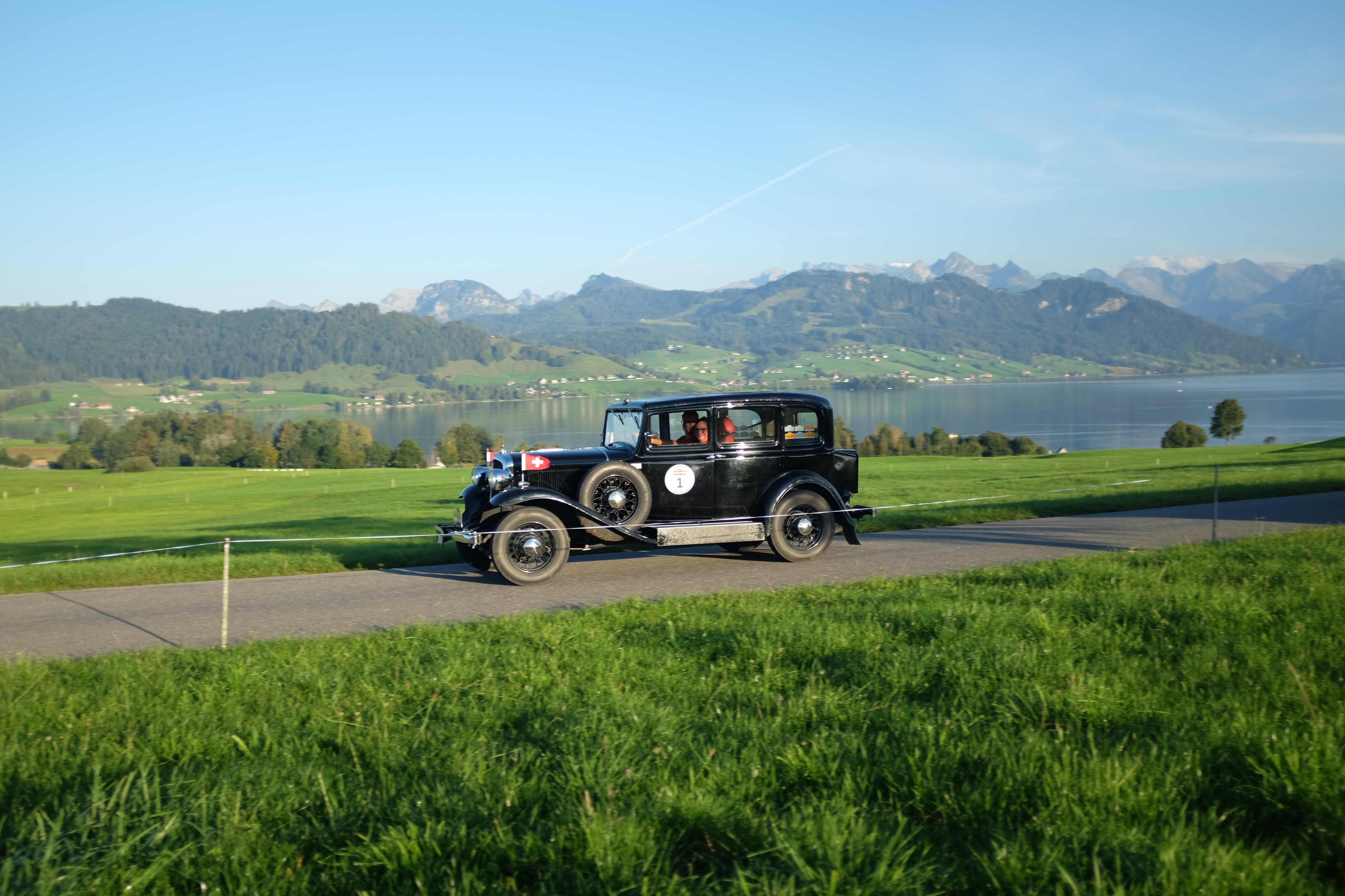 Der Weg zum Start der 5. Reguarity war kurz und führte uns auf die Ibergeregg. Wir fanden die von uns vorbereitete Strecke ins Muotathal auf Anhieb inklusive aller verlangten Fotosujet. Das Ende dieser Regularity war gleichbedeutend mit dem Start der nächsten Transferstrecke und führte uns über den Pragelpass, am Klöntalersee vorbei nach Niederurnen. Der Verkehr über den Pragelpass war beträchtlich und die Ausweichstellen der häufig nur einspurig befahrbaren Strecke waren gut besucht. Den Vogel, resp. den Verkehr abgeschossen hat ein uns entgegenkommender Lastwagen mit mindestens 10 weiteren Fahrzeugen im Schlepptau, darunter auch Holländer, welche mit der kurvenreichen Strecke ziemlich gefordert schienen. Wir konnten den breiten Lastwagen nach mehreren Versuchen mit einem knappen Zentimeterabstand kreuzen, was aber den nachfolgenden Automobilisten im wesentlich schmaleren Fahrzeug komplett zu überfordern schien. Mit viel gutem Zureden und klaren Anweisungen ist dieses Manöver auch bei diesem und den folgenden Fahrzeugen gelungen. Ein paar Kilometer weiter war die Strasse wegen temporären Holzschlages gesperrt und wir warteten knapp ein Viertelstunde, bis es weiter ging. Nach der Passhöhe war eine Bauequipe daran, den Strassenbelag Meter für Meter aufzureissen und auf einen Lastwagen zu verladen. Immer wenn ein Lastwagen voll war, wurde der aufgerissene Bereich notdürftig eingeebnet und die wartenden Fahrzeuge konnten mehr oder weniger zügig passieren. Alles in allem haben wir auf dem Pragelpass wohl gegen eine halbe Stunde verloren, was unserer guten Laune aber keinen Abbruch tat. Das Wetter war ausgezeichnet, die Temperaturen angenehm und dank des eingebauten Kühlschrankes blieben unsere Getränke kühl .